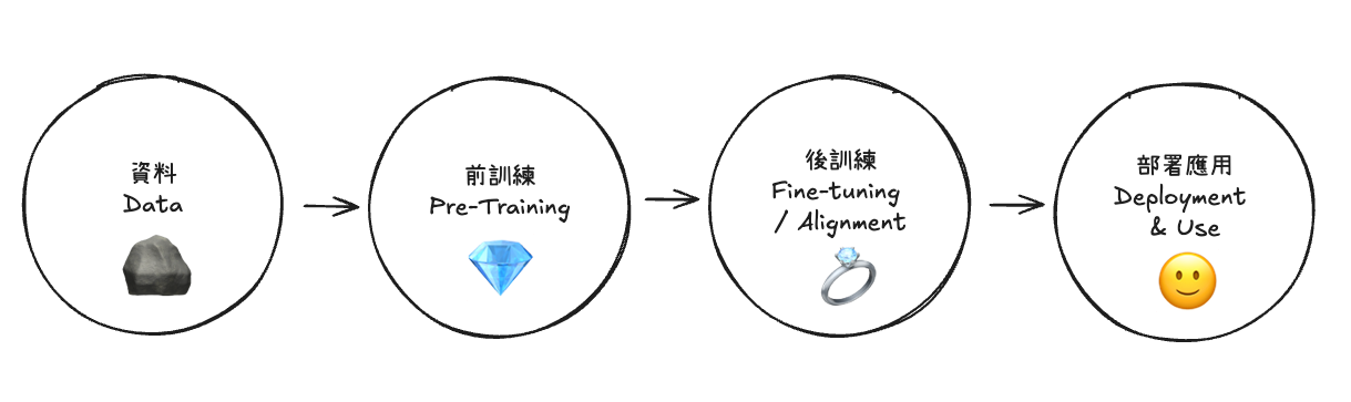 太長不想閱讀,大致上是這樣來的:資料處理 > 前訓練 > 後訓練 > 部署應用。
